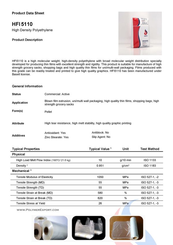- Melt Flow Index (190°C/5.0 kg): 0.33 g/10 min